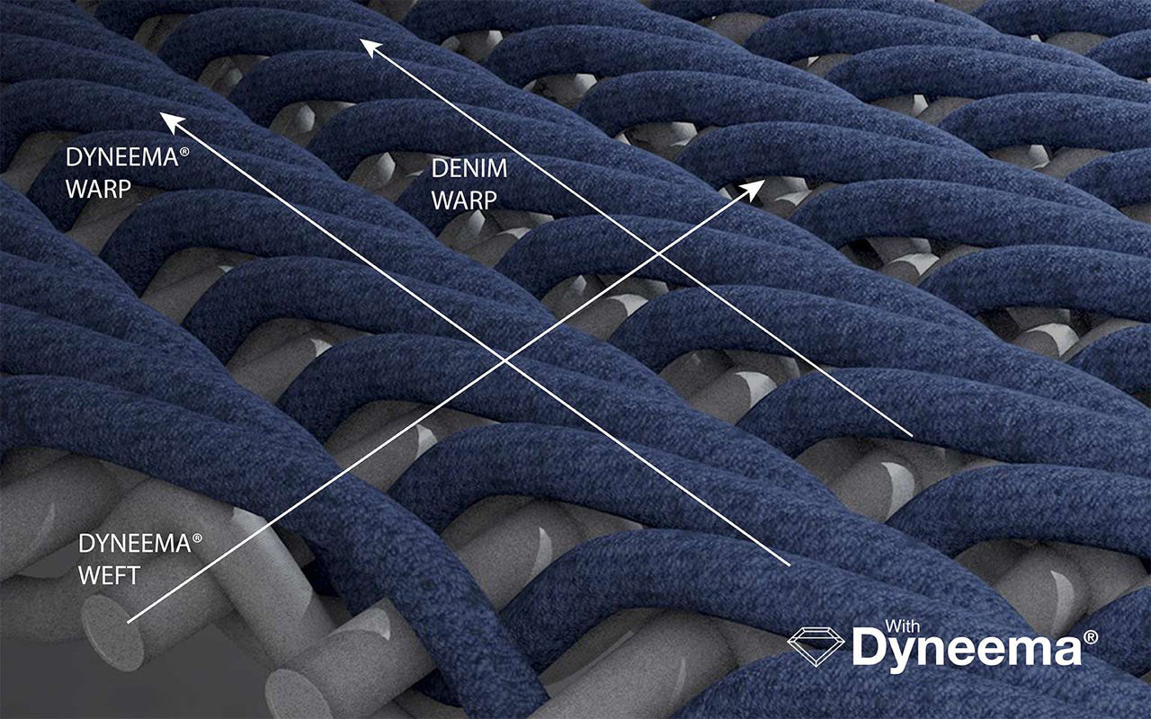 The main difference between Dyneema® and Armalith® is how UHMWPE fiber forms an invisible but super-strong mesh inside the cotton fabric. Dyneema® uses a unique double warp beam with cotton on the front and Dyneema® on the back and weft. Armalith® uses a different weaving technology. Every Armalith yarn is a composite of the UHMWPE core and Indigo cotton covering. This allows use of more UHMWPE without losing the comfortable properties of regular Denim.
